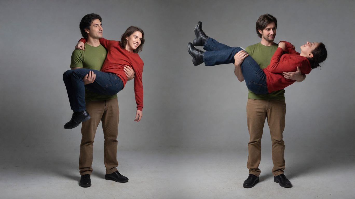 ✅ Prompt: Take the two men and place them in the exact poses of the man in green carrying the man in red. Preserve their identities, body proportions, and clothing details. Ensure the pose is natural and realistic, with consistent lighting, shadows, and perspective. Photorealistic, high-resolution result.