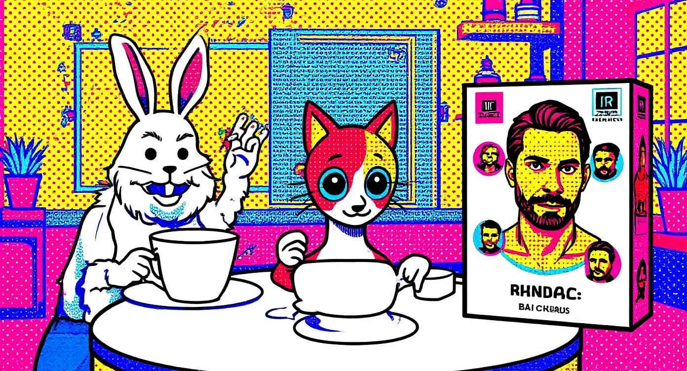 Convert to 60's Pop Art Style,generate a bunny, a dog, and a cat having tea around a white table.