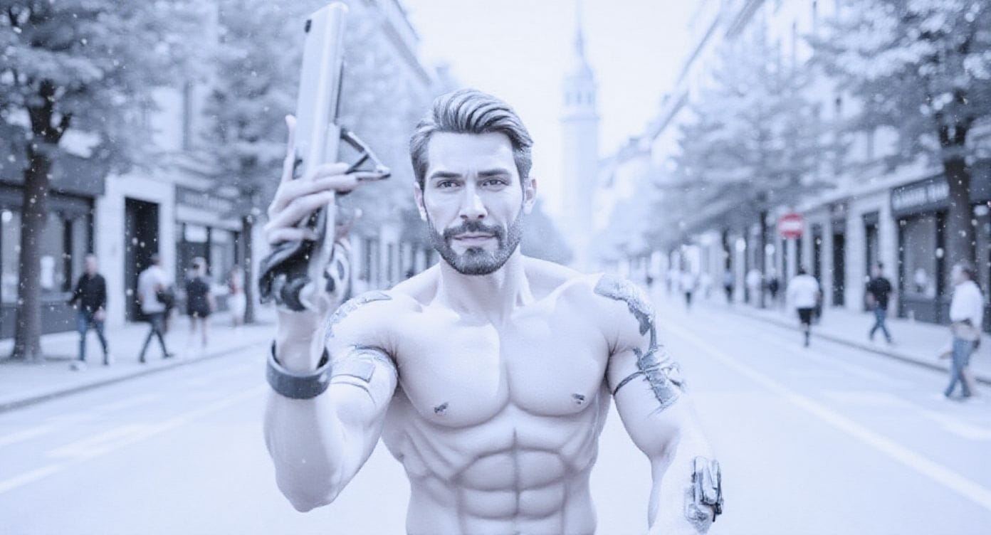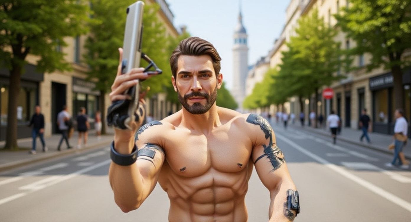 “He's now taking a selfie on a sunny street in Paris,” keeping the same position and pose