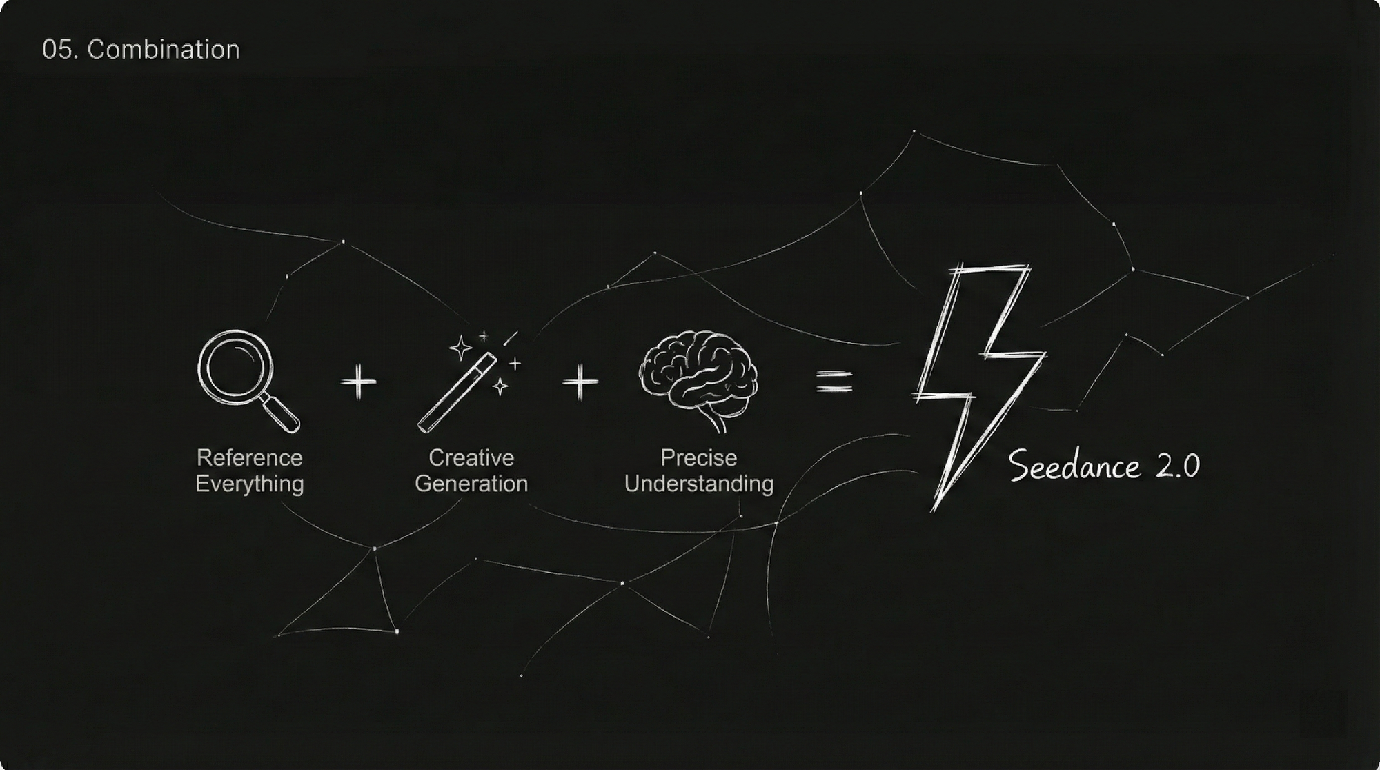 Formula: Seedance 2.0 = Multi-Modal Reference (Reference Anything) + Strong Creative Generation + Precise Command Understanding