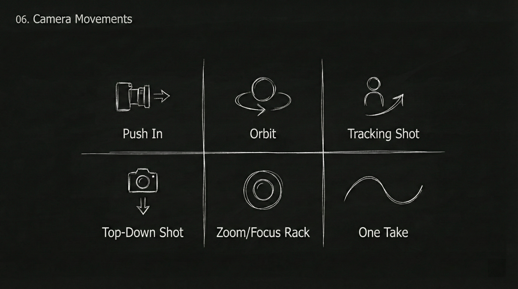 - Camera movement styles, lens language